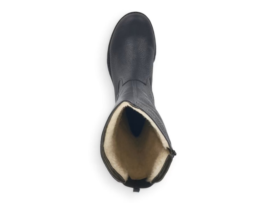 Černé kozačky RIEKER s pružnými gumičkami v zadní  části se dokonale přizpůsobí Vašim nohám a vytvoří dokonalé pohodlí . Díky zipu z vnitřní části boty se budou lehce nazouvat. V chladných dnech oceníte zateplení pravou ovčí vlnou a podešev s hrubým vzorem, která je flexibilní a absorbuje nárazy při došlapu díky technologii Antistress.
